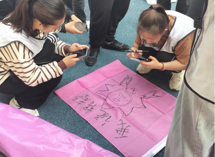 活动开始,在指导老师的组织下,学生们依次进行了分组、制作队旗、创造趣味口号、分配团队站位等环节。活动过程中,同学们共同思考、努力创作,展现了各自的特色,集思广益,增强了团队意识。“无言以队”、”疯狂戴夫队、“青青草原队”等趣味队名体现了当代青年人追求自我、昂扬向上的精神风貌。