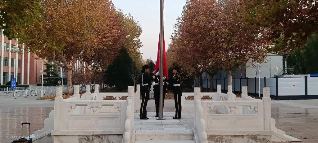 国歌庄严奏响,五星红旗在晨光中缓缓升起,全体师生面向国旗肃穆行礼。
