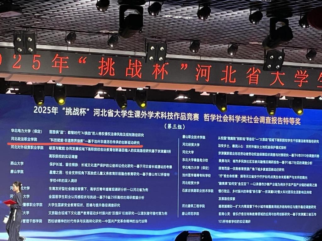 我系《科技赋能·非遗跨界焕新”——基于沧州非遗活态传承的创新驱动研究》学生项目团队以饱满的热情参与路演展示与答辩环节,从创新性、先进性、社会价值等多方面深入阐述项目内容,最终以出色的创新成果和实践价值,从全省众多参赛项目中脱颖而出,荣获特等奖。这一成绩的取得,充分彰显了我系在创新人才培养与学术实践领域的卓越成果。