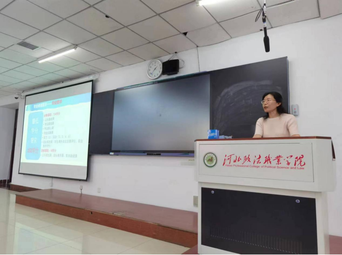 郝静老师首先对法律事务(行政执法方向)的学生进行专业解读,首先介绍了行政执法方向的专业介绍,要求我们德、智、体、美、劳全面发展,践行社会主义核心价值观,主动适应依法治国和经济社会的发展要求,培养具有科学思维方式,具备与行政法务领域相适应的文化素养和法律素养。教育我们成为一个高素质,高技能复合型法务人才。后又进行了专业课方面进行了介绍,例如法理学,后像学生们介绍了行政执法的就业前景,并希望我们学生做一个正直合格的法务人。