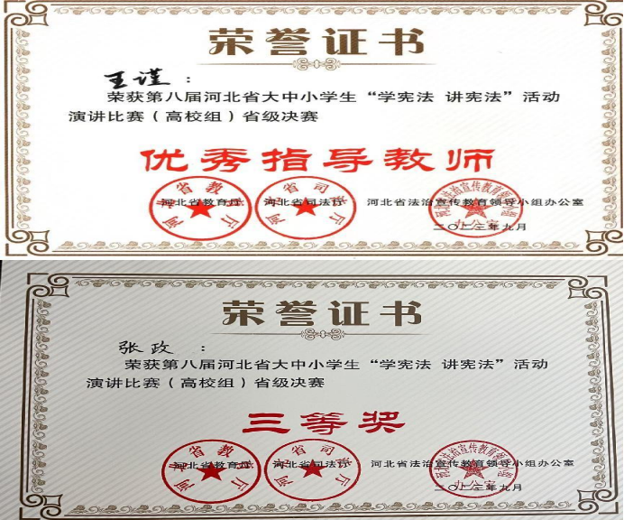 在演讲比赛中,张政以《青山一道同风雨,宪法何曾与人离》为题,从建设好中国式的现代化探索到“宪法至上,人民至上!”的真正含义,从时代的发展中找寻宪法制度的完善与实现中华民族伟大复兴的中国梦的关系。最后,张政呼吁青年要学宪法、懂宪法,用青春力量助推国家司法建设,奋力谱写社会主义现代化发展,为中华民族伟大复兴的中国梦的实现凝聚磅礴伟力的崭新篇章。经过河北省高校64名演讲选手激烈角逐,张政获得演讲竞赛(高校组)省级决赛三等奖。