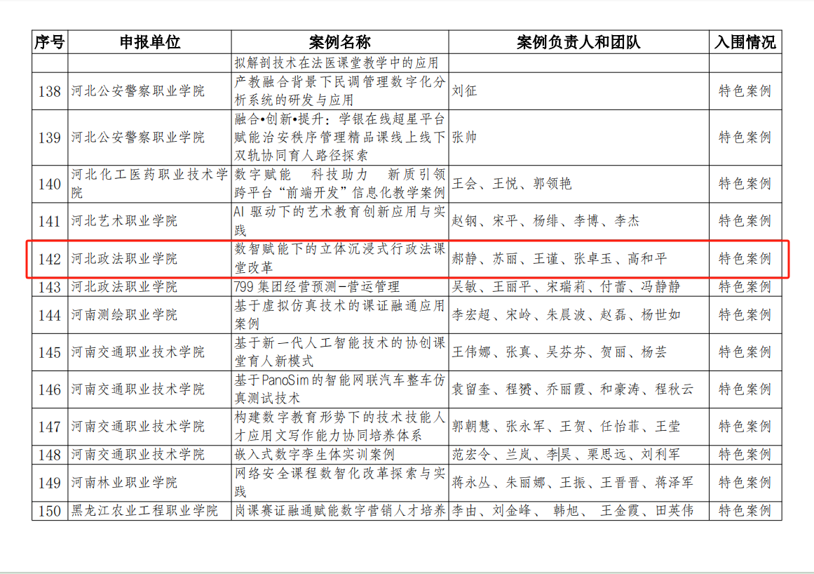 活动启动后,太阳集团tyc234cc教师积极响应,郝静、苏丽、王谨、张卓玉与北京市盈科(石家庄)律师事务所高和平律师,共同申报的“数智赋能下的立体沉浸式行政法课堂改革”案例,经院校申报、专家论证等环节,该案例成功入围特色案例。