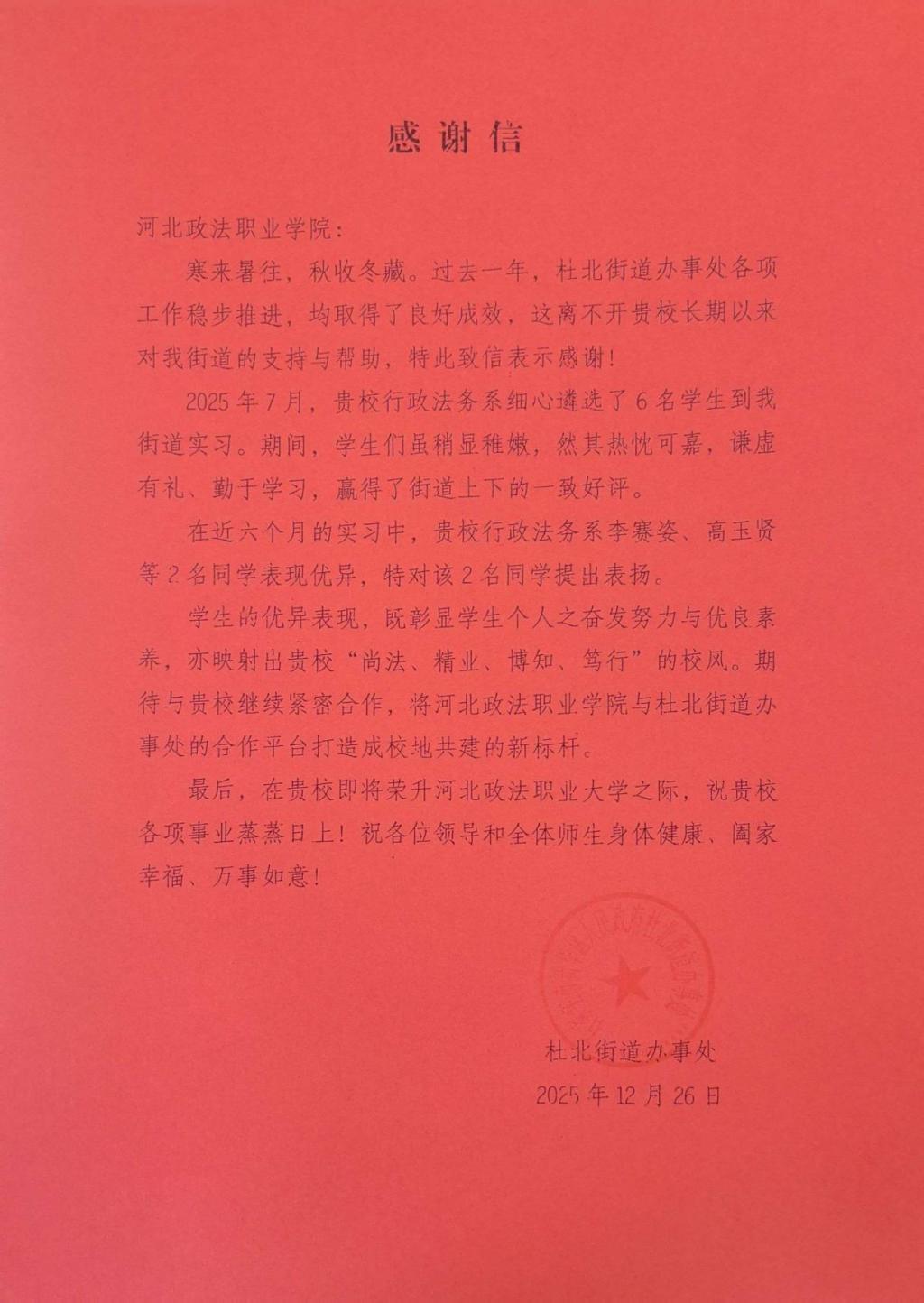 此次实习不仅为学生搭建了优质的实战平台,也为杜北街道办事处注入了青春法治力量。双方均表示,未来将继续探索更广泛的合作模式,共同培养更多高素质的应用型行政法务人才。