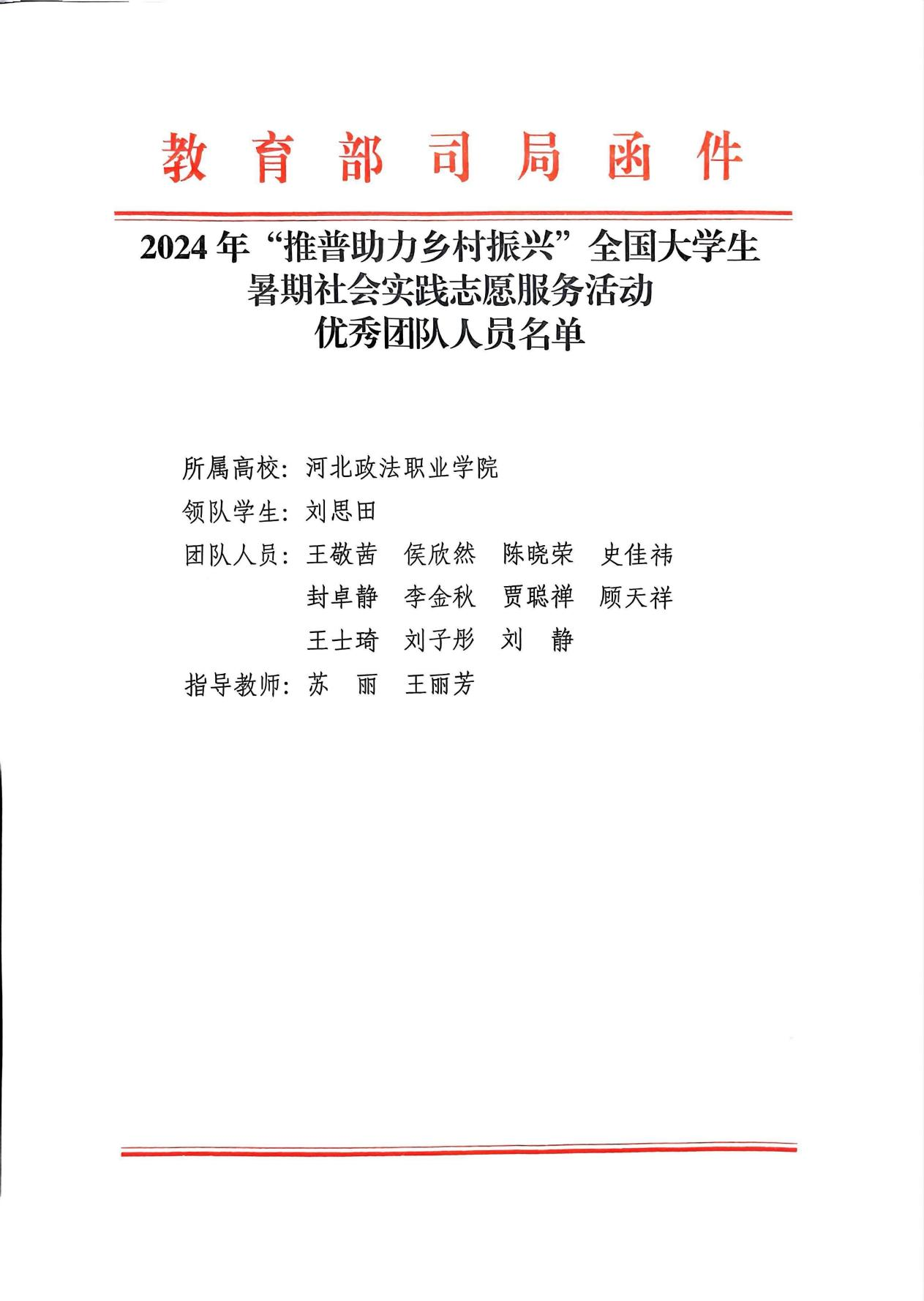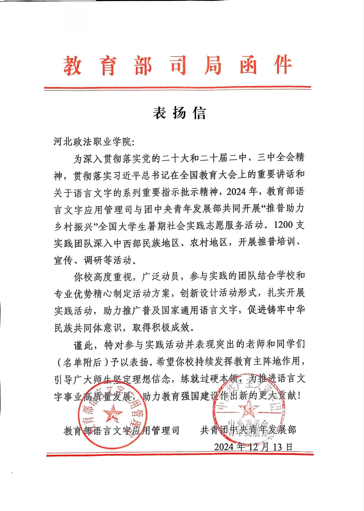 为深入贯彻落实党的二十大和二十届二中、三中全会精神,贯彻落实习近平总书记在全国教育大会上的重要讲话和关于语言文字的系列重要指示批示精神,我系“未来普法”宣传队积极行动,参与教育部语言文字应用管理司与团中央青年发展部共同组织的2024年度“推普助力乡村振兴”全国大学生暑期社会实践志愿服务活动,奔赴保定市阜平县细沟村积极开展推普助力乡村振兴的实践,致力于开展推动普通话普及、促进法治建设的红色活动,最终从全国1200支实践团队中脱颖而出,获评全国大学生暑期社会实践志愿服务活动优秀团队,并受到教育部、团中央表扬。同时活动获得了人民网、中国教育信息网等媒体的关注与报道,社会反响良好。
