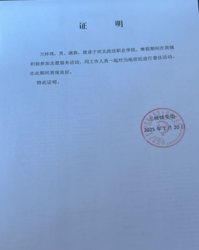 万梓琦同学积极参与土城镇双新社区举办的“普及法律知识,共建和谐社区”志愿活动。活动期间,他协助法律专家开展法律讲座,承担了多项关键工作,不仅加深了自身对法律知识的理解,更深刻体会到志愿普法对社区和谐稳定的重要意义,坚定了他持续参与公益活动的决心。
