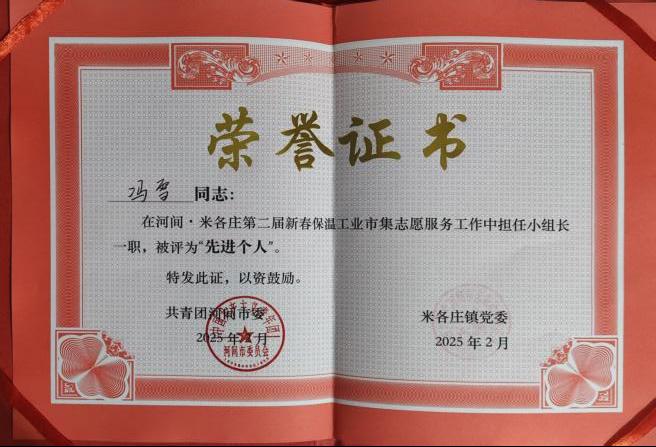 冯雪同学参与了河间市政府组织的“河间·米各庄第二届新春保温工业市集志愿者活动”并担任小组长一职。活动期间,她合理分配任务,带领小组成员协助摊主搬运物资、布置摊位,还热情地为前来逛市集的市民答疑解惑引导人流有序通行。此次志愿服务,不仅让她积累了丰富的组织协调经验,更激发了她持续投身志愿服务、助力社会活动的热情。