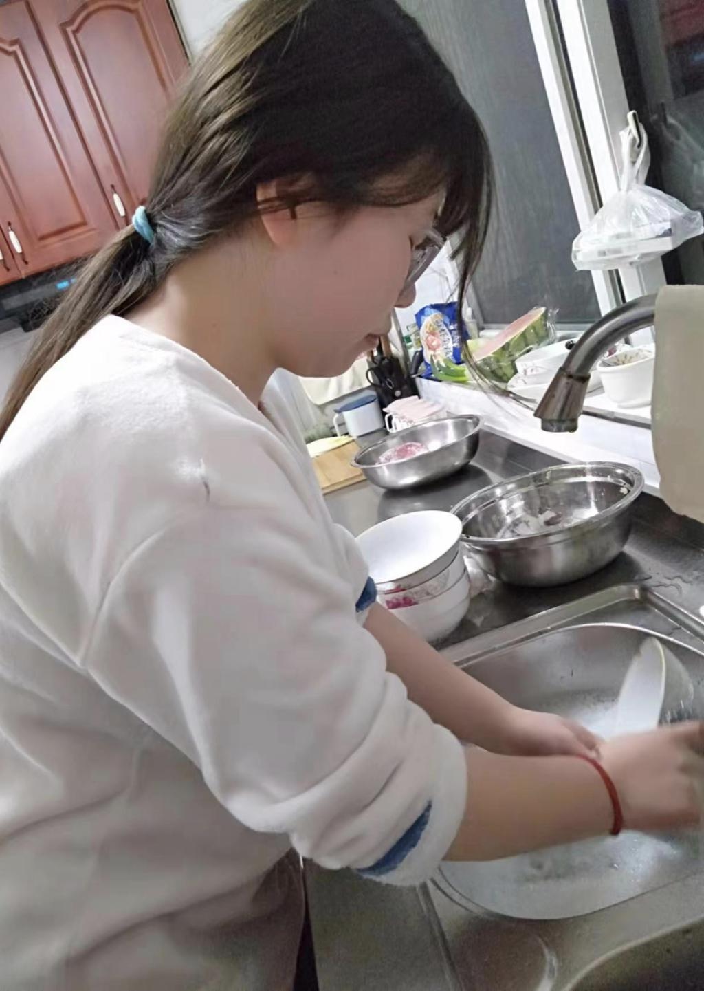 23级法律事务(政府法务方向)1班杨晴主动肩负起家务重任,收拾餐具,打扫厨房。